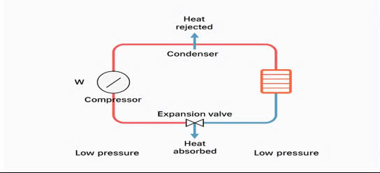 Nén khí: Máy nén nén môi chất lạnh ở dạng hơi, làm tăng áp suất và nhiệt độ.