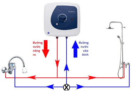 Nước được đưa vào bình → điện trở bên trong làm nóng nước → nước nóng được lưu trữ sẵn trong bình để khi cần thì cấp ra cho vòi.