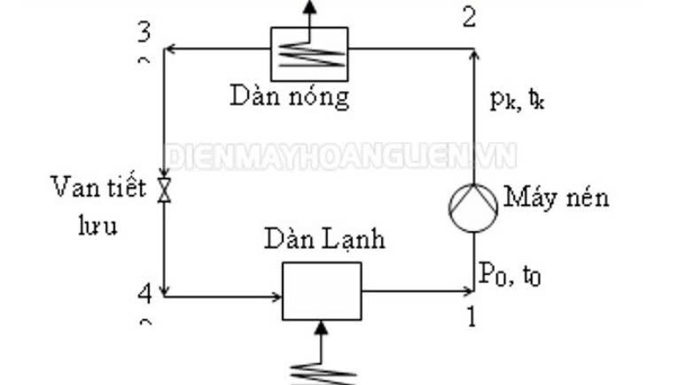 Môi chất lạnh sau khi bay hơi tại dàn lạnh sẽ được máy nén hút về và nén lên áp suất cao. Sau đó, môi chất đi qua dàn ngưng để tỏa nhiệt ra môi trường, tiếp tục qua van tiết lưu để giảm áp suất và quay lại dàn bay hơi. Chu trình này diễn ra liên tục nhằm duy trì nhiệt độ ổn định cho không gian hoặc thiết bị cần làm lạnh.
