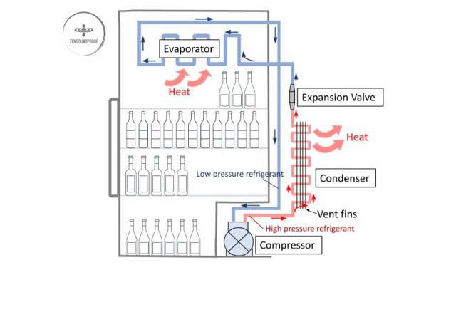 Tủ bảo quản rượu hoạt động dựa trên nguyên lý làm lạnh tương tự tủ lạnh, nhưng được tối ưu hóa: